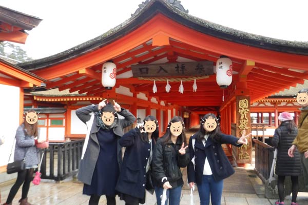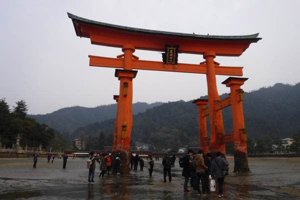 厳島神社では、潮が引き、大木で作られた鳥居をまじかに見ることができました。
